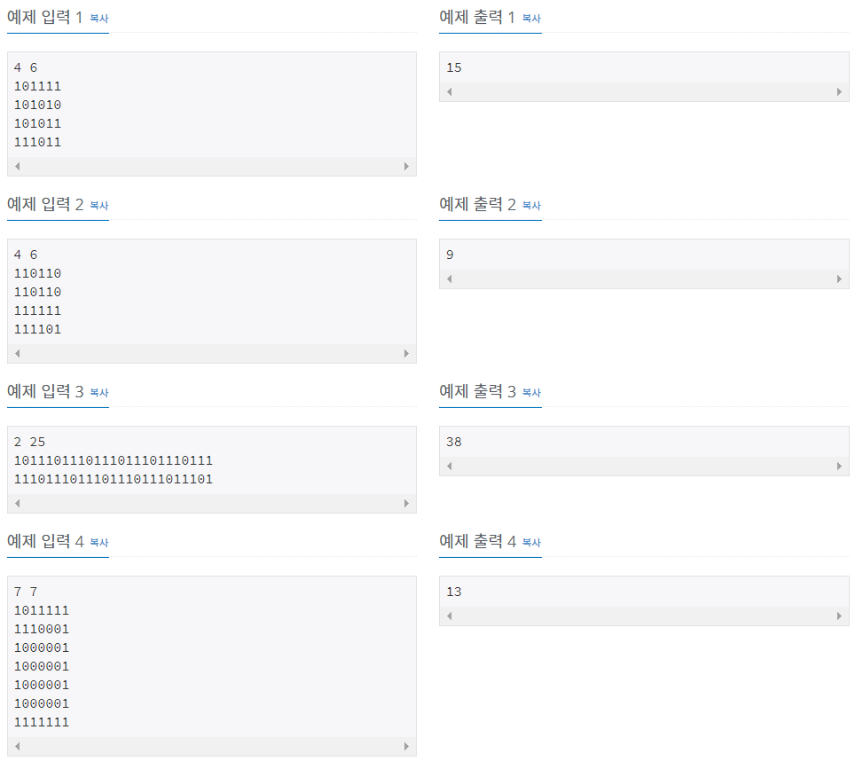 첫째 줄에 두 정수 N, M(2 ≤ N, M ≤ 100)이 주어진다. 다음 N개의 줄에는 M개의 정수로 미로가 주어진다. 각각의 수들은 붙어서 입력으로 주어진다.
