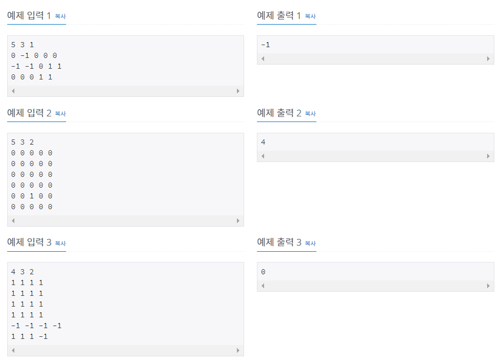 첫 줄에는 상자의 크기를 나타내는 두 정수 M, N과 쌓아 올려지는 상자의 수를 나타내는 H가 주어진다. M은 상자의 가로 칸의 수, N은 상자의 세로 칸의 수를 나타낸다. 단, 2 ≤ M ≤ 100, 2 ≤ N ≤ 100, 1 ≤ H ≤ 100이다. 둘째 줄부터는 가장 밑의 상자부터 가장 위의 상자까지에 저장된 토마토들의 정보가 주어진다. 즉, 둘째 줄부터 N개의 줄에는 하나의 상자에 담긴 토마토의 정보가 주어진다. 각 줄에는 상자 가로줄에 들어있는 토마토들의 상태가 M개의 정수로 주어진다. 정수 1은 익은 토마토, 정수 0 은 익지 않은 토마토, 정수 -1은 토마토가 들어있지 않은 칸을 나타낸다. 이러한 N개의 줄이 H번 반복하여 주어진다.
