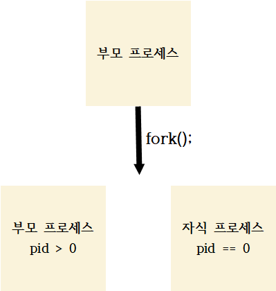 프로세스를 복사하는 함수이다. fork는 기본적으로 복제가 되면 부모와 자식 프로세스가 생기게 된다. 이때 자식과 부모를 구분하기 위해서 pid를 할당해 주게 되는데 부모의 경우 무작위 양수를 할당하고 자식의 경우 0의 값을 할당받게 된다. 이를 통해서 자식과 부모를 구분할 수 있다.
