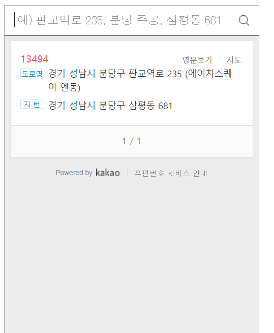 다음과 kakao에서 제공하는 우편번호 검색 api로 우리가 쉽게 주변에서 우편번호를 입력할 때 가장 많이 보는 형식이다. 나는 이제 해당 api를 활용하여 회원가입의 주소 입력 칸을 해결할 것이다.