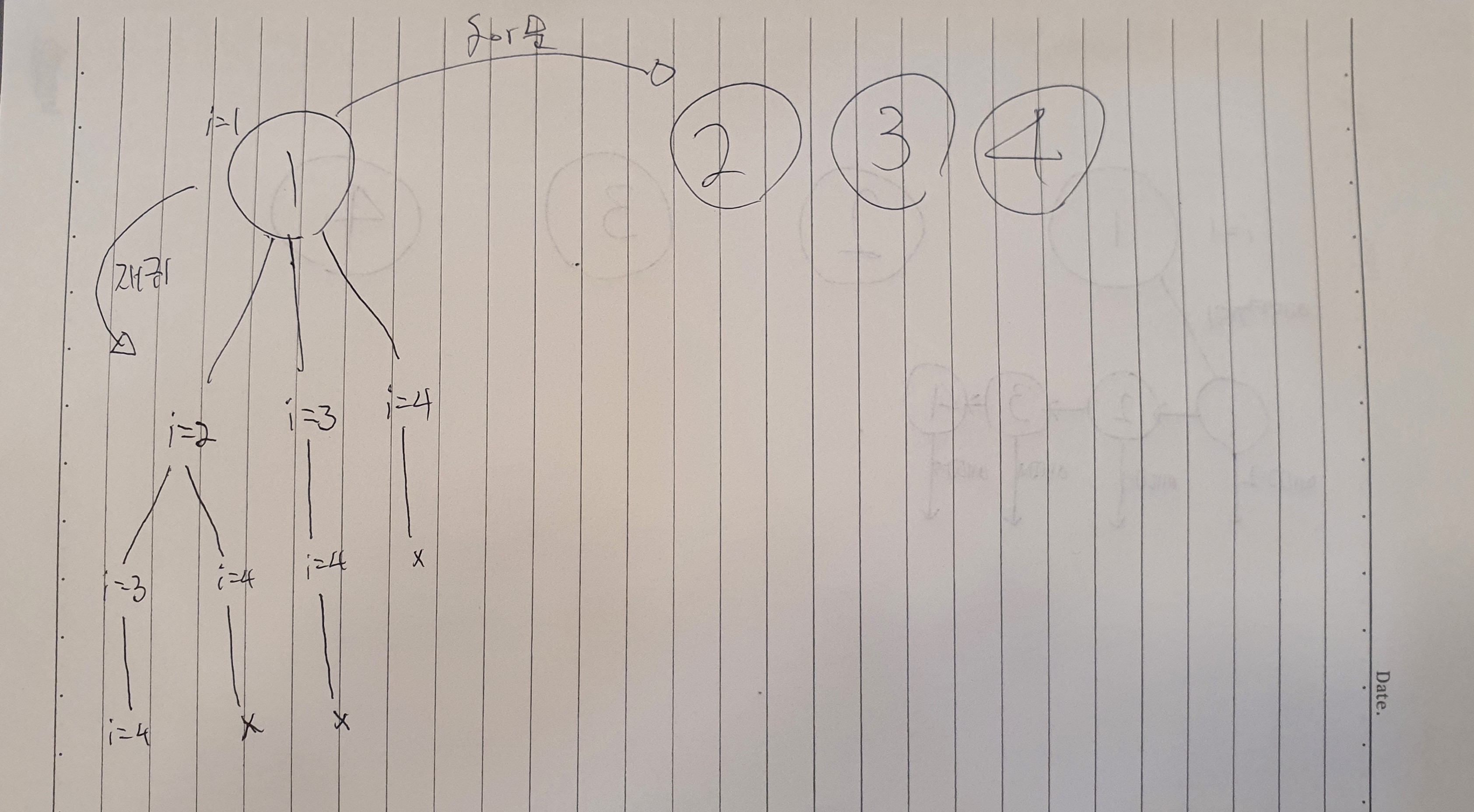 dfs를 말로 서술하기란 너무 어려운 거 같습니다 ㅜㅜ 이런 식으로 첫 번째 for문에서 i가 1 ~ 4까지 반복을 하면서 각 번호에 맞는 arr [0]의 값을 저장하고 재귀로 들어가게 됩니다. 평행 세계 느낌으로 첫 번째 i=1일 때는 arr [0]=1이 되고 그 아래로 갈수록 arr [1], arr [2]. arr [3]의 값들이 저장되게 되죠. 그러나 저희는 항상 depth를 생각해 봐야 합니다. 따라서 제가 x를 친부분은 바로 if문에 의해 걸러지기 때문에 해당 값들을 x를 치게 되었죠.