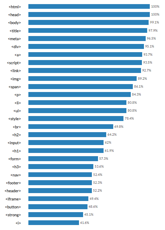 아래 그림은 현재 웹사이트 상에 있는 HTML 태그의 빈도수를 나타냅니다. 이중의 대부분의 태그를 알아볼 수 있었습니다. 하나하나 차근차근 배워 보도록 해요