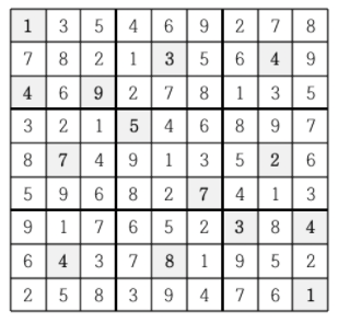 굵은 선으로 구분되어 있는 3x3 정사각형 안에도 1부터 9까지의 숫자가 한 번씩만 나타나야 한다.