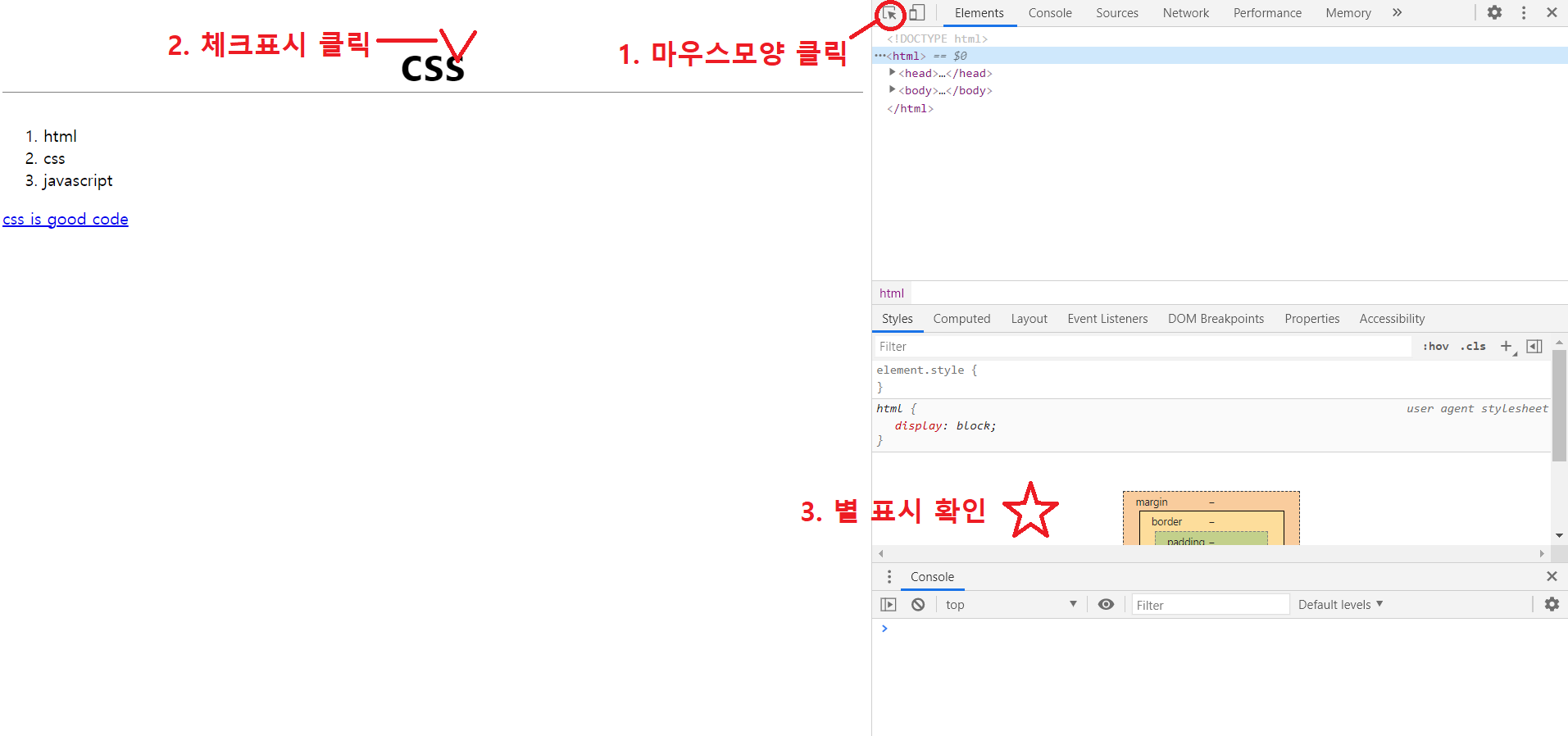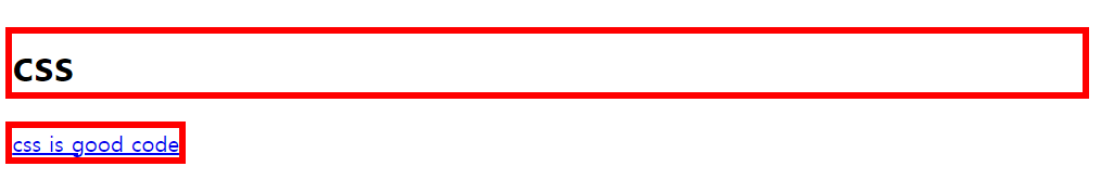 보시면 css의 경우 큰 박스가 생성되고 "css is good code"라는 텍스트는 작은 박스가 생성되는 것을 알 수 있습니다.
