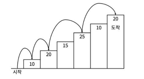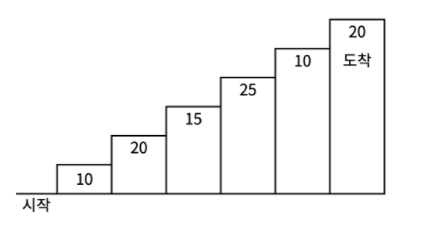 예를 들어 <그림 2>와 같이 시작점에서부터 첫 번째, 두 번째, 네 번째, 여섯 번째 계단을 밟아 도착점에 도달하면 총점수는 10 + 20 + 25 + 20 = 75점이 된다.