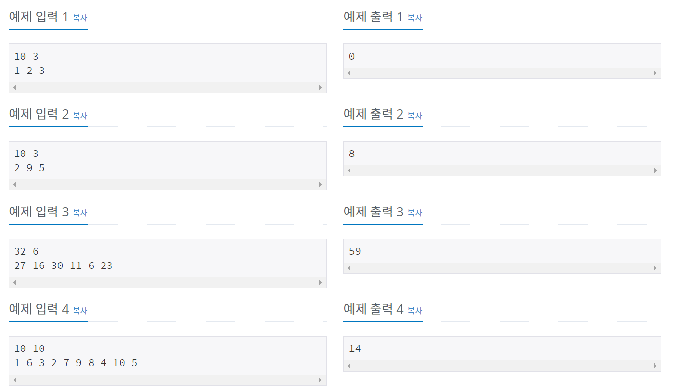 첫째 줄에 큐의 크기 N과 뽑아내려고 하는 수의 개수 M이 주어진다. N은 50보다 작거나 같은 자연수이고, M은 N보다 작거나 같은 자연수이다. 둘째 줄에는 지민이가 뽑아내려고 하는 수의 위치가 순서대로 주어진다. 위치는 1보다 크거나 같고, N보다 작거나 같은 자연수이다.
