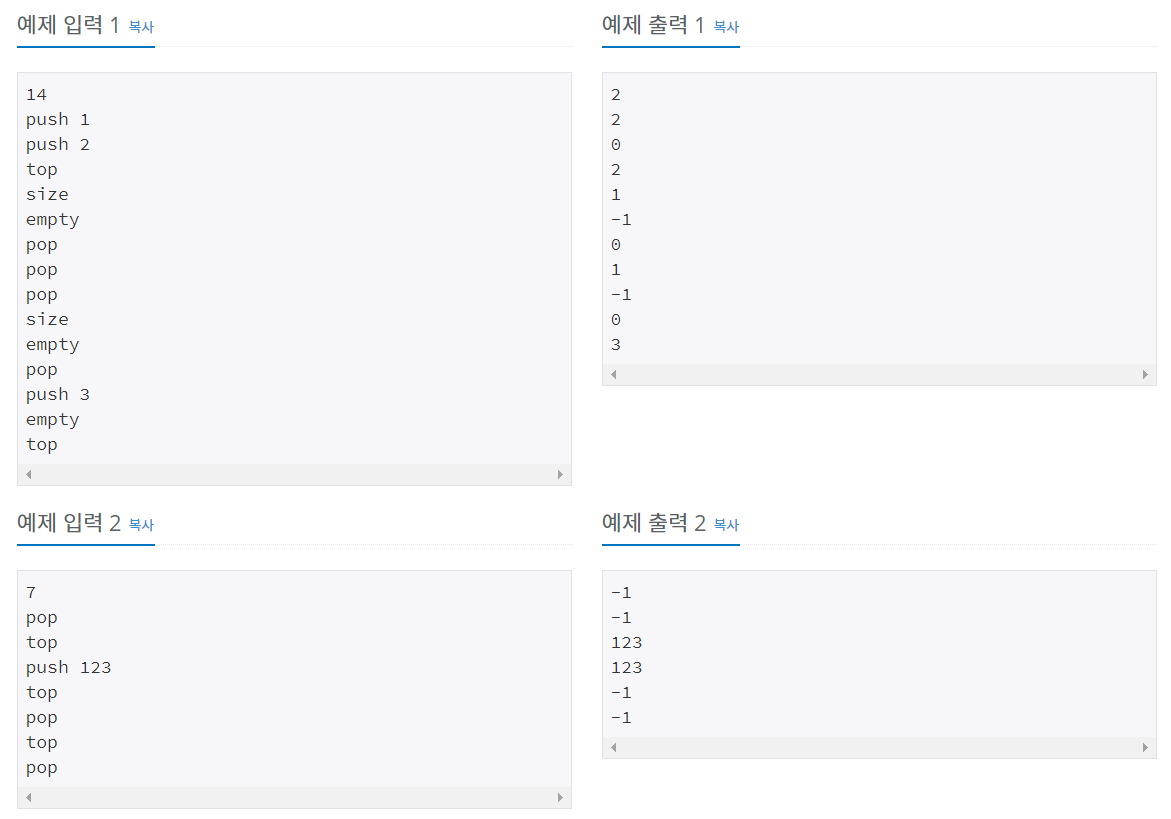 정수를 저장하는 스택을 구현한 다음, 입력으로 주어지는 명령을 처리하는 프로그램을 작성하시오.