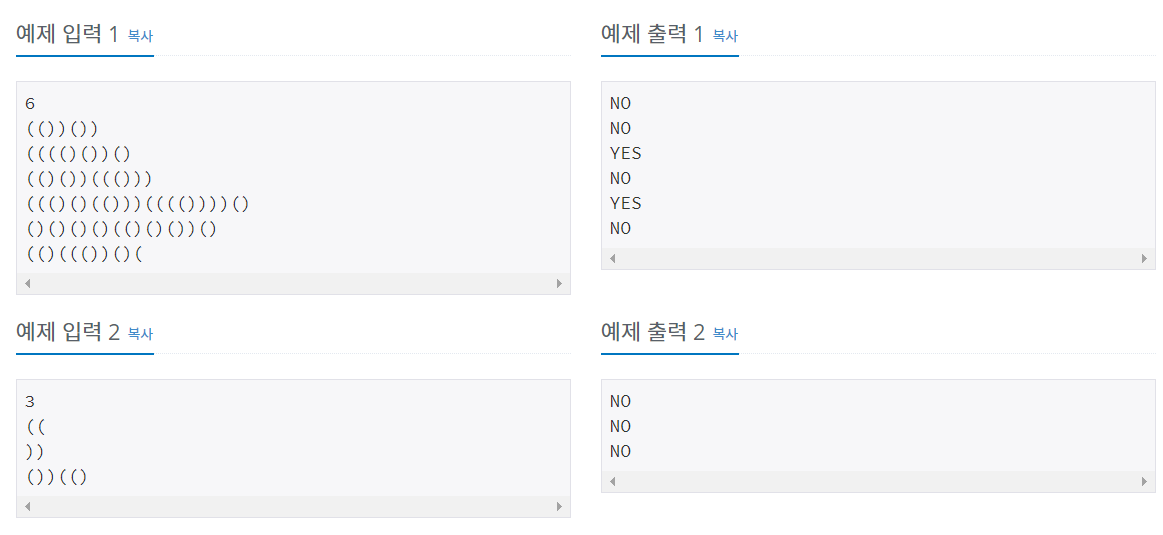 출력은 표준 출력을 사용한다. 만일 입력 괄호 문자열이 올바른 괄호 문자열(VPS)이면 “YES”, 아니면 “NO”를 한 줄에 하나씩 차례대로 출력해야 한다.